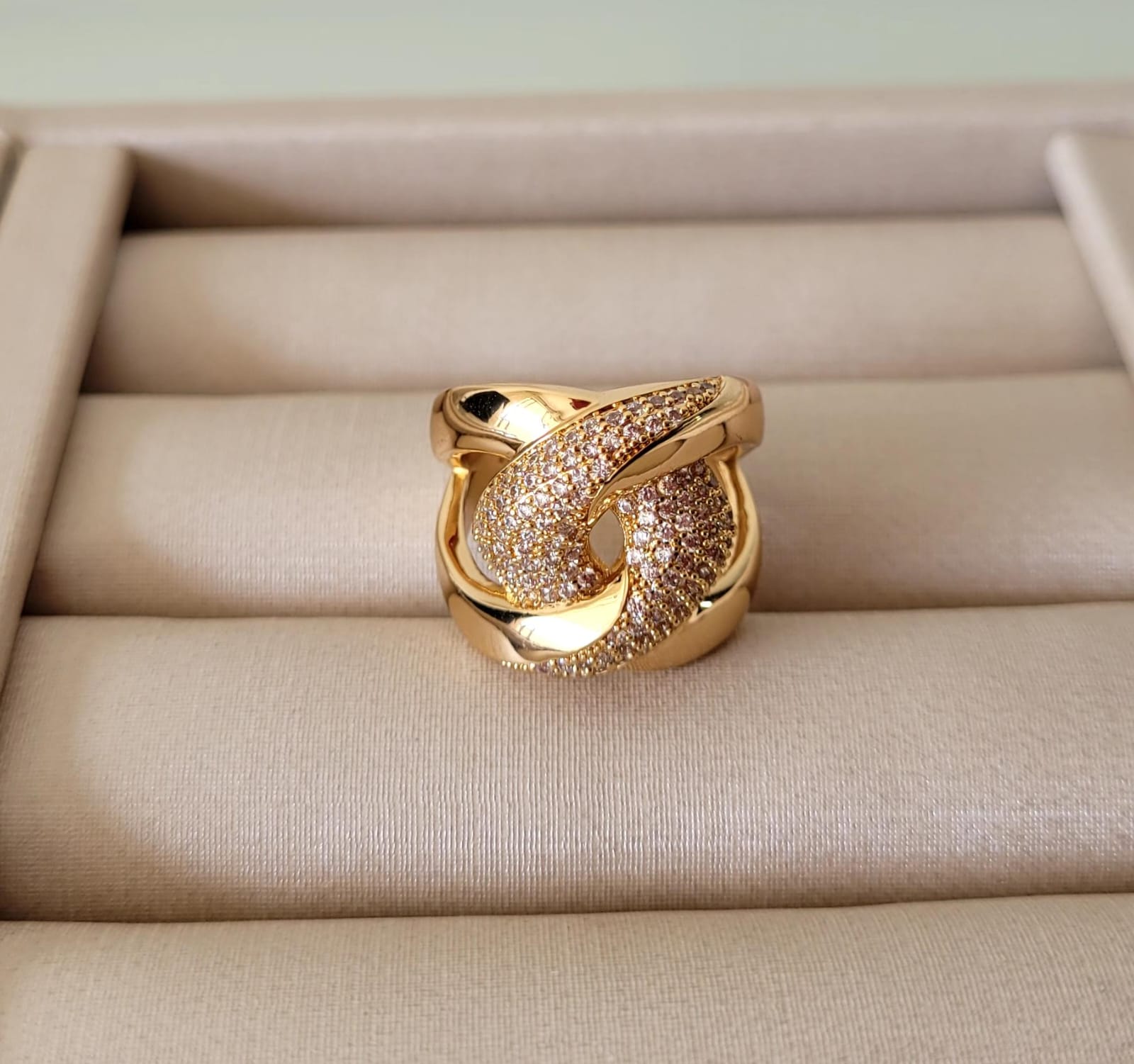 O anel Entrelace Mix Cravejado possui um design moderno e sofisticado. Ele apresenta um formato oval com um entrelaçamento de linhas que criam um efeito visual marcante. A parte central do anel é adornada com micro zircônias que proporcionam um brilho intenso e elegante. O anel é perfeito para ocasiões especiais, como festas, casamentos e eventos formais.