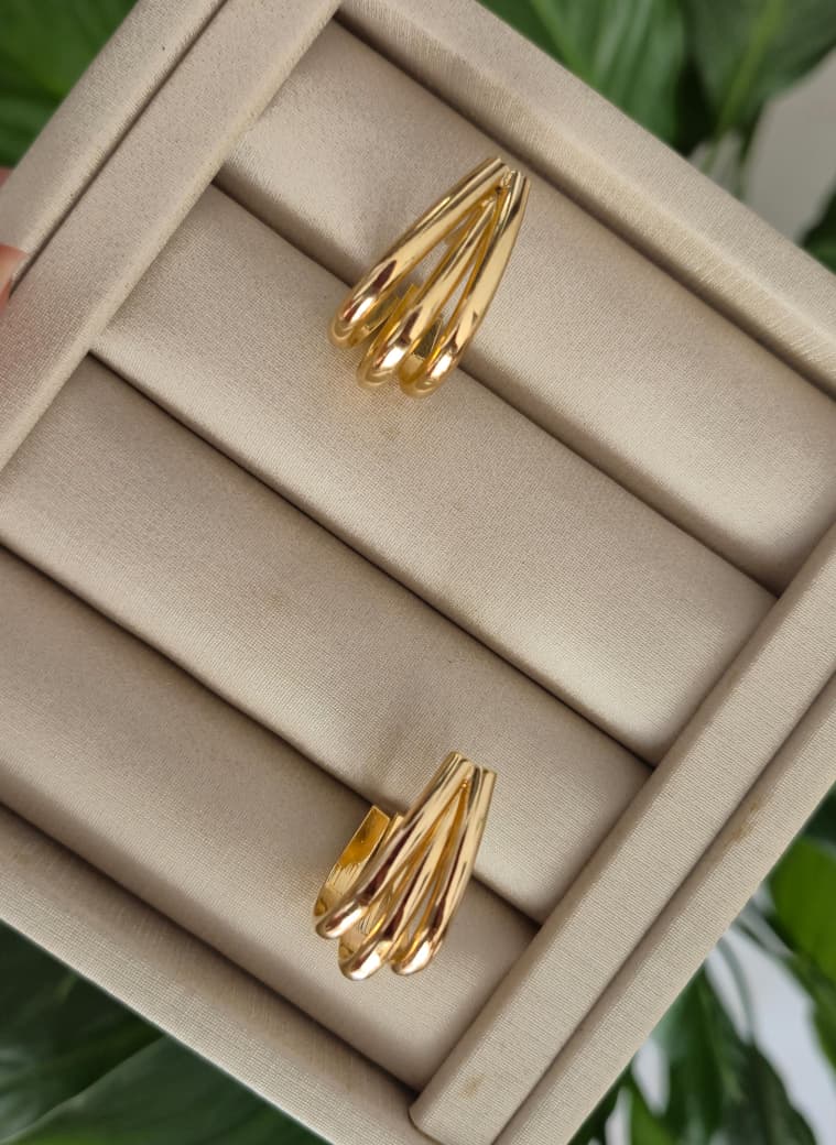 Este brinco apresenta acabamento dourado que realça o brilho e o estilo, ideal para combinar com roupas casuais ou sofisticadas. O fechamento tipo gancho (hook) proporciona facilidade ao colocar e maior segurança no uso. Este modelo tríplice composto por tubos achatados (flat) é perfeito para quem busca acessórios com design único e delicado.