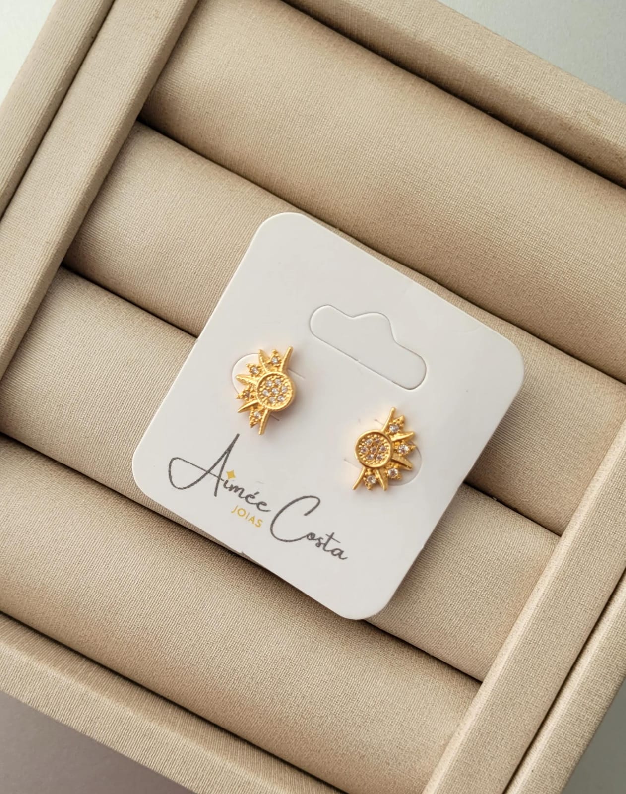 Brinco Sol Cravejado em Banho de Ouro 18k.