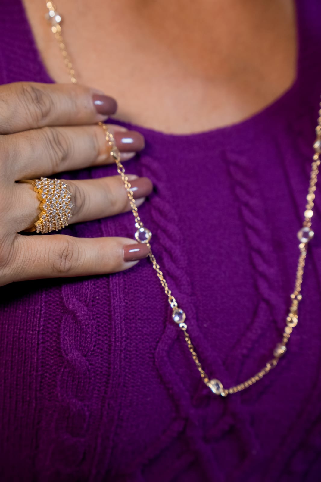 O colar é leve e confortável para uso diário ou ocasiões especiais. Possui acabamento dourado com pequenos cristais ou pontos de brilho arredondados, evidenciando um toque sofisticado. É uma peça versátil que pode ser combinada com outros acessórios para complementar o look.
