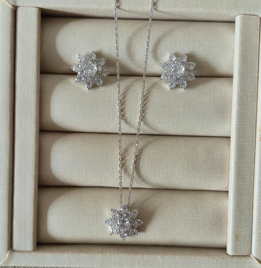 Descubra o Conjunto Flower Shine, perfeito para quem busca elegância e sofisticação em semi joias. Este conjunto inclui brincos e colar com pingente em formato de flor, feitos em acabamento de pedras de zircônia, garantindo um brilho intenso e refinado. O design delicado floresce em qualquer ocasião, seja para uso diário ou eventos especiais, elevando seu estilo com um toque feminino e moderno.